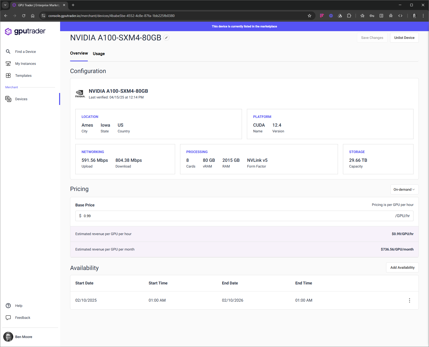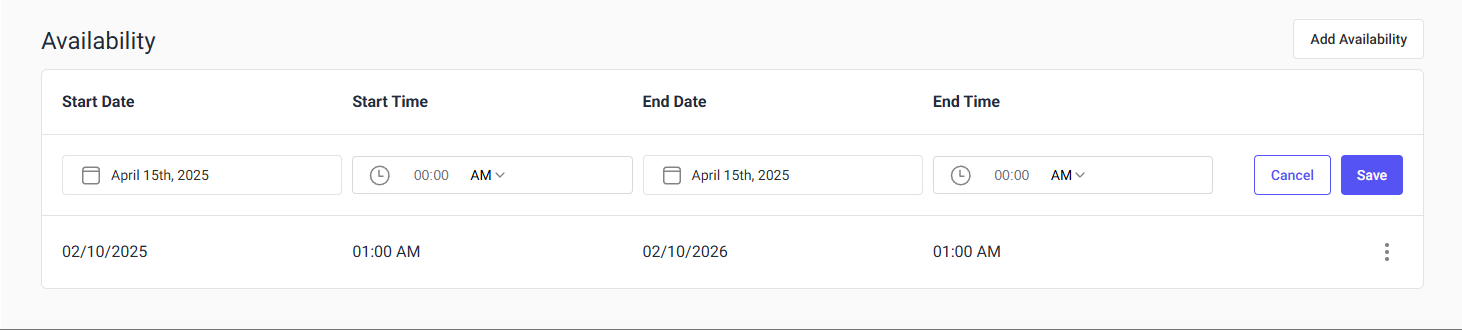 Click ‘Add Availability’ to schedule when the device is listed on the platform.