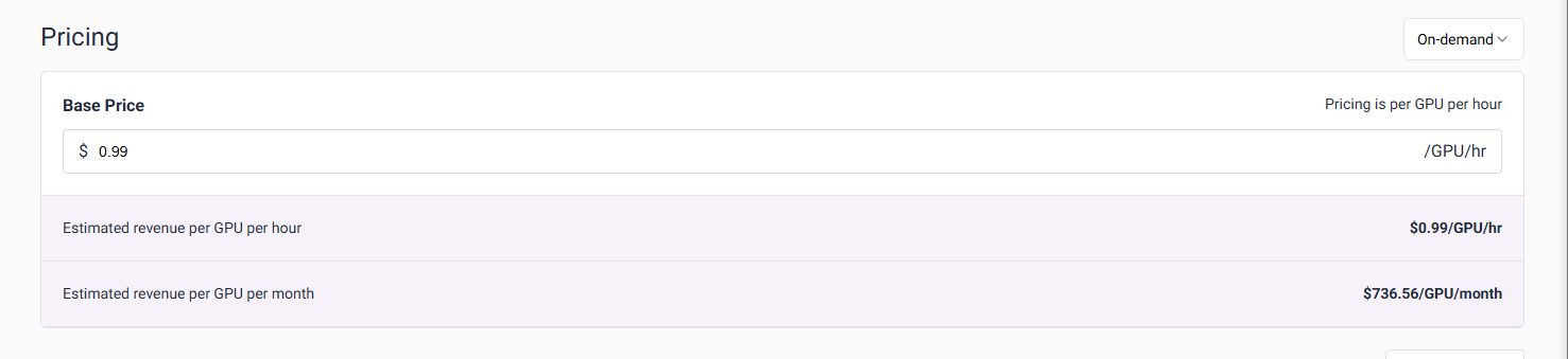 In the pricing section of your device configuration page, choose ‘On-demand’ or ‘Reserved’ for your instance type.On-demand Instances will require you to choose a base price for each GPU card per hour.