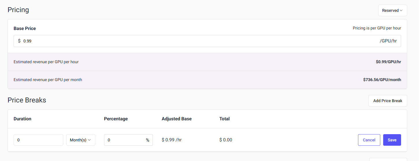 Reserved Instances will also require you to choose a base price. However, you will be given an additional option to create price breaks for a specific duration of time.