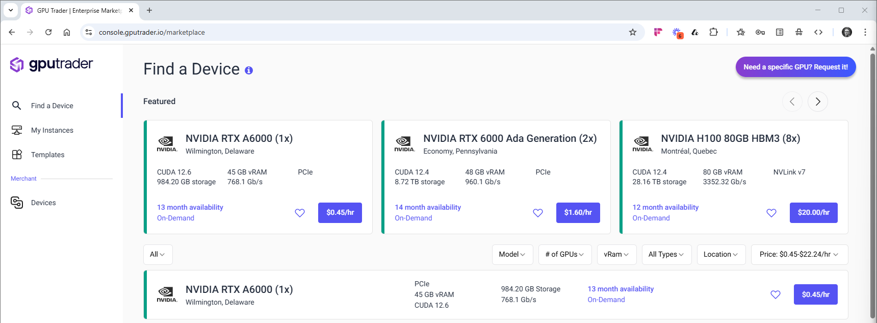 Use the Find a Device page to browse available GPUs. Filter by model, price, or provider to select a system that meets ComfyUI’s requirements.