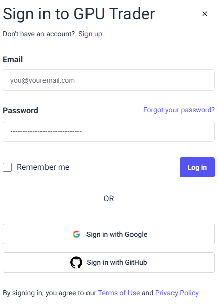 Start by signing in or creating an account on GPU Trader. If you need help, watch the GPU Trader Quickstart or read the docs.