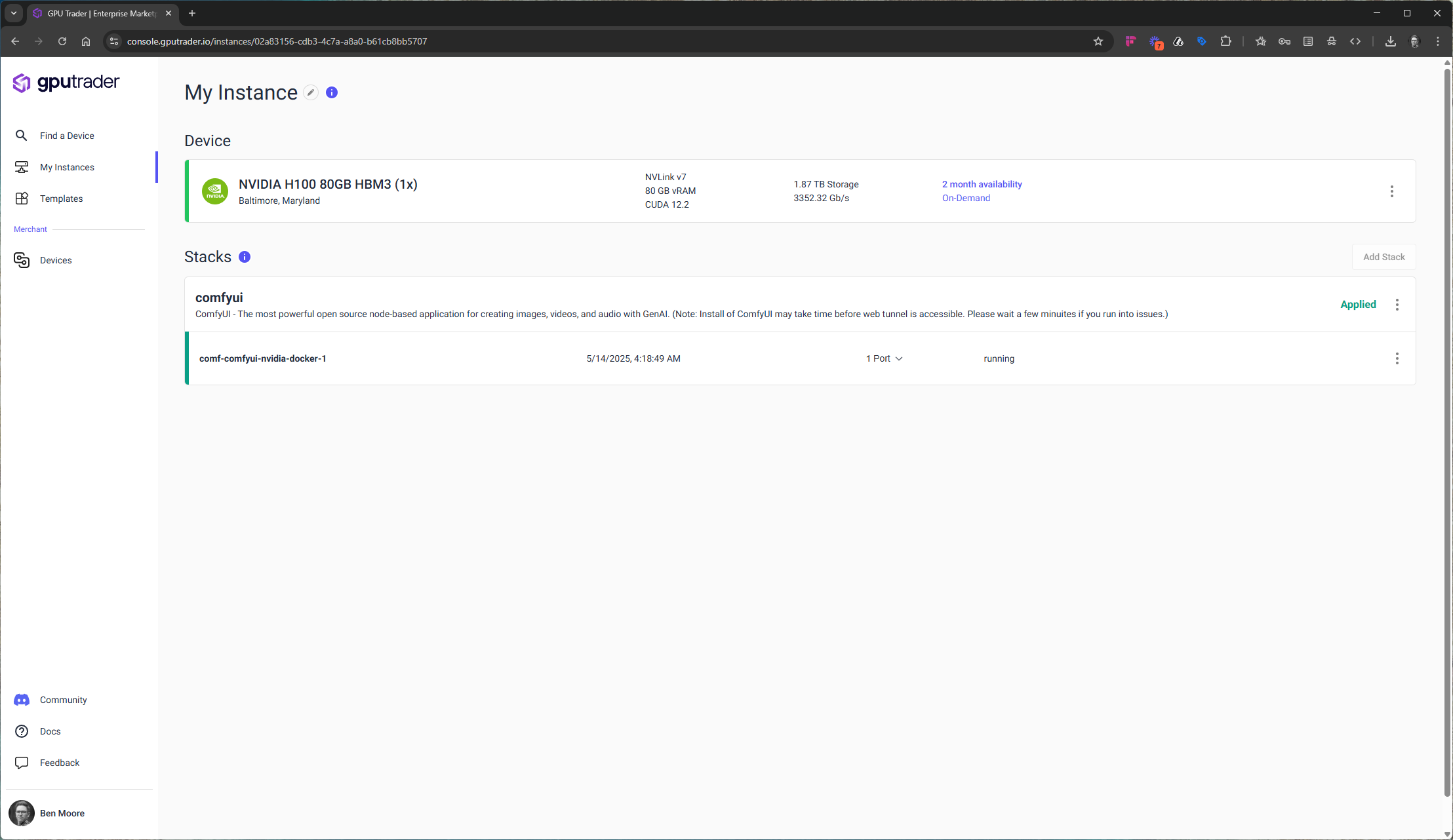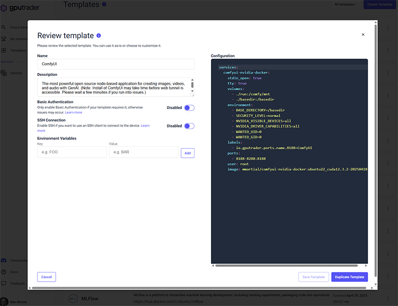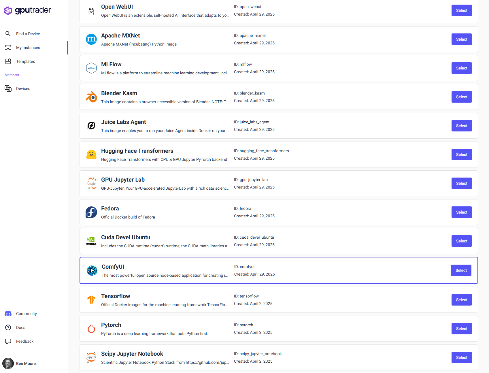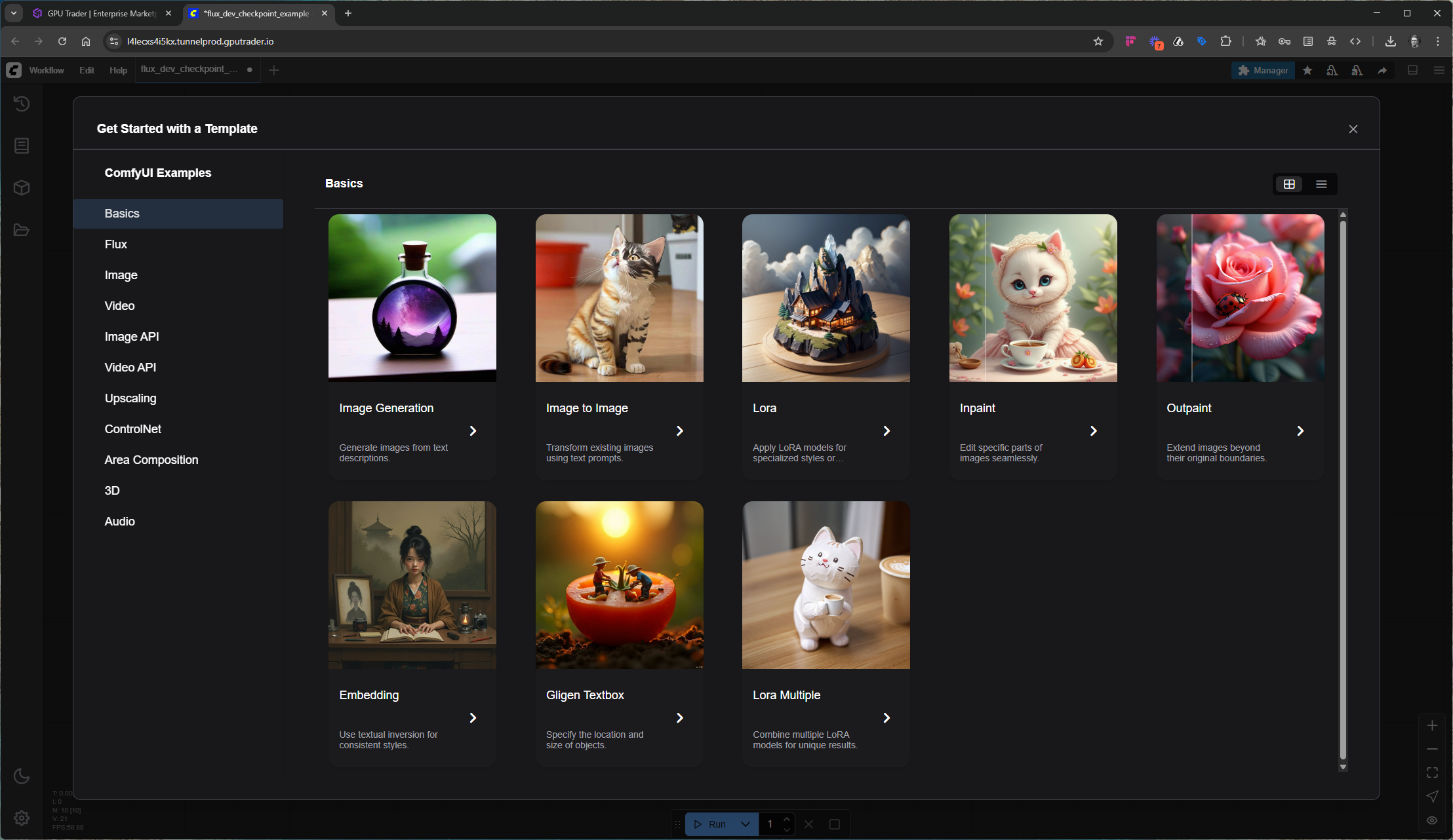 ComfyUI is a powerful, node-based interface for running Stable Diffusion and other diffusion-based models. It gives creators, developers, and researchers full control over their image generation workflows through a visual graph editor. Each step—from prompt handling and model selection to sampling and post-processing—is represented as a customizable node, making it easy to experiment, iterate, and optimize. ComfyUI is popular among advanced users for its transparency, modularity, and reproducibility, and it runs locally or on GPU-powered containers without requiring complex setup. GPU Trader supports ComfyUI out of the box, so you can launch your own fully configured environment in minutes—no installs, no guesswork. Use this guide to rent your first GPU Trader instance and start creating!Install ComfyUI on GPU Trader