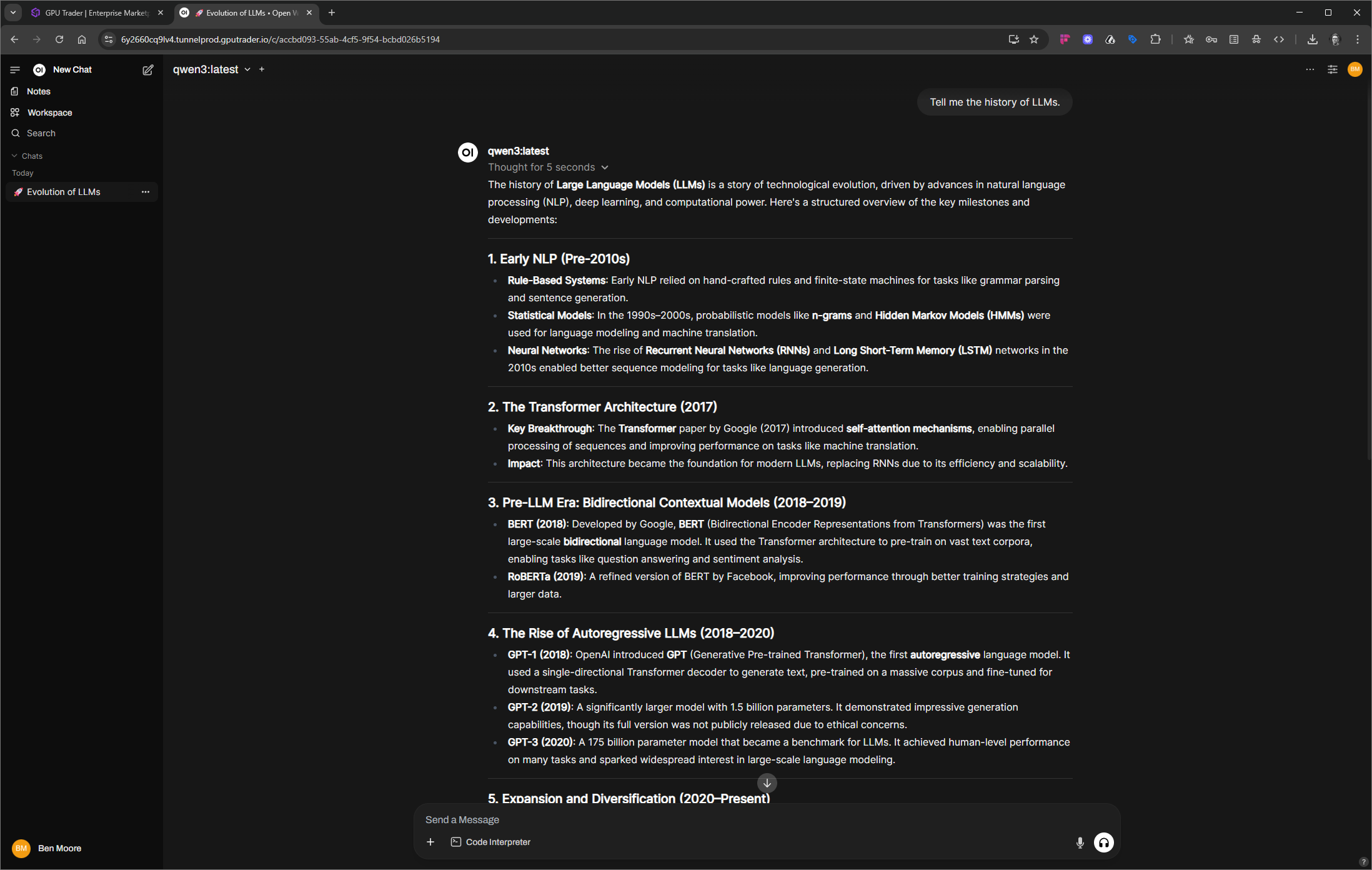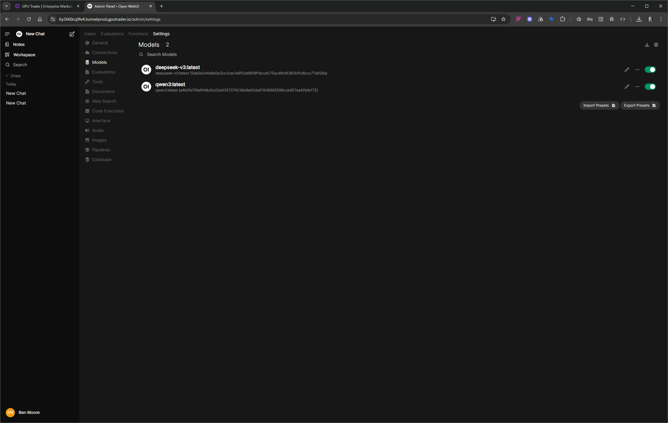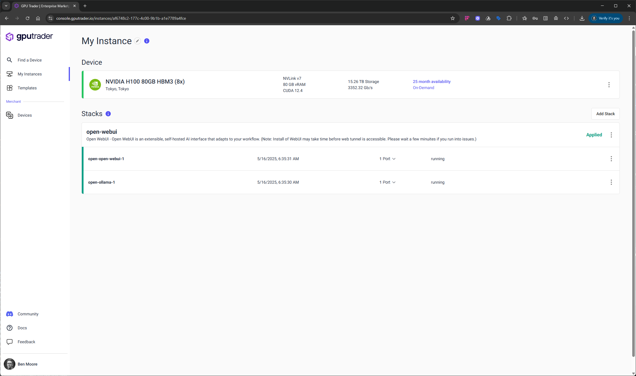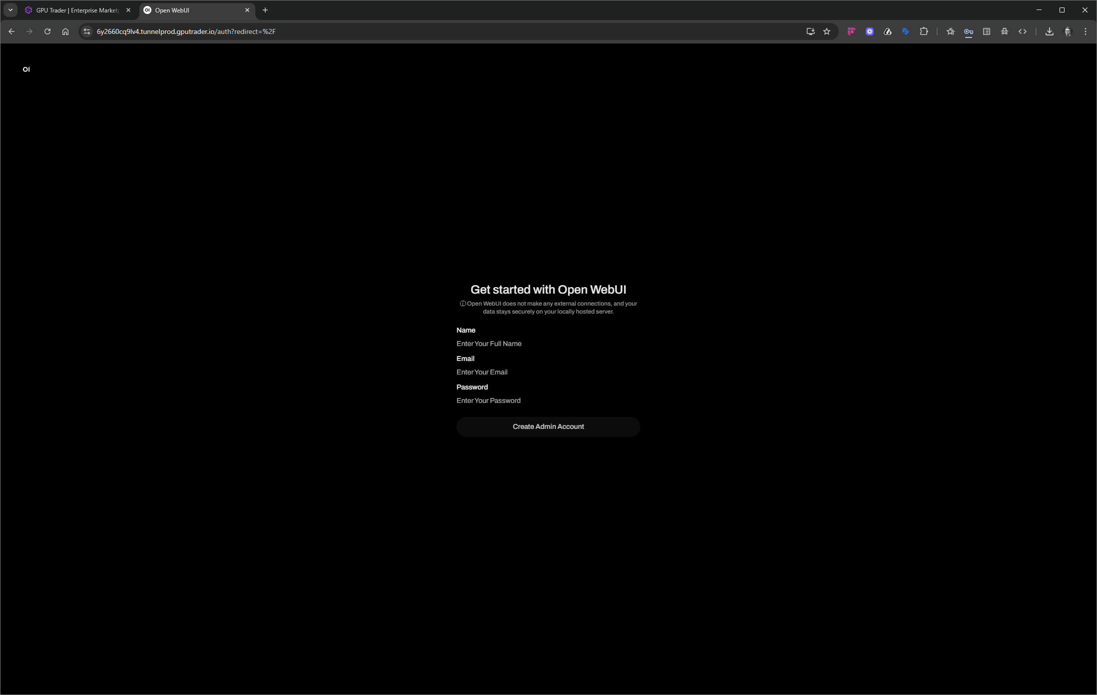 Open WebUI is an open-source, browser-based interface for interacting with large language models (LLMs) like those running on Ollama, LM Studio, or local GGUF models. Designed for speed, simplicity, and privacy, Open WebUI offers a clean chat interface with support for multi-user access, prompt history, system prompts, and customizable personas. It runs entirely on your own hardware or containerized environment, ensuring full control over data and model execution. GPU Trader offers a pre-configured managed template to deploy Open WebUI in a single click—making it easy to run private, performant LLMs without needing cloud accounts or API keys.Install Open WebUI on GPU Trader